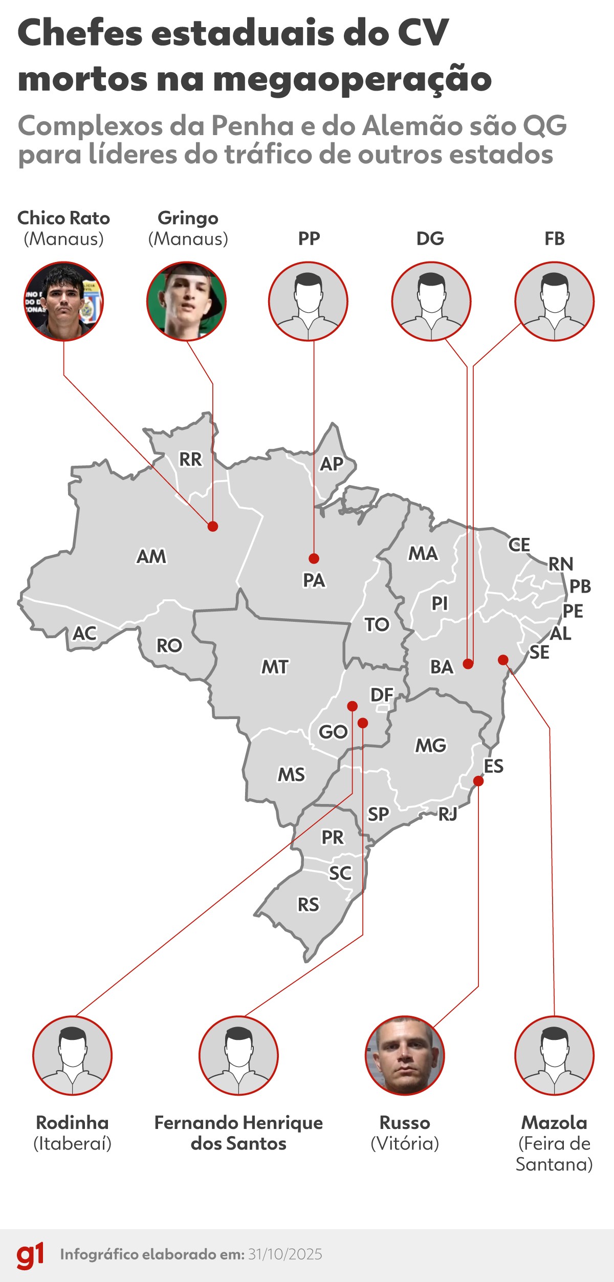 A Polícia do Rio de Janeiro apresentou, em coletiva de imprensa realizada nesta sexta-feira (31), os resultados de uma megaoperação realizada nos Complexos da Penha e do Alemão na última terça-feira (28). O balanço aponta que 11 suspeitos naturais da Bahia perderam a vida durante a ação, e três deles foram identificados como líderes do tráfico de drogas na Bahia.